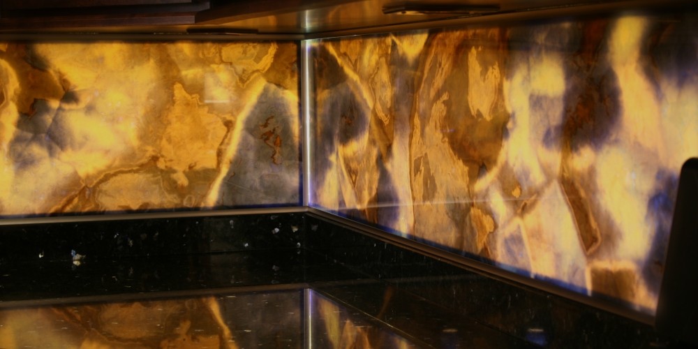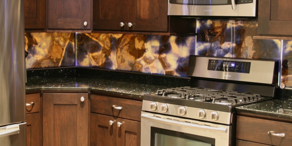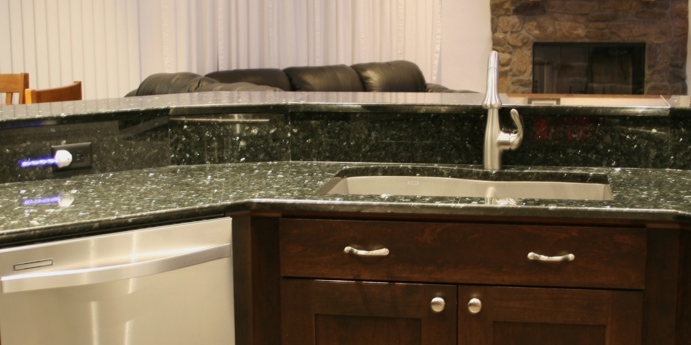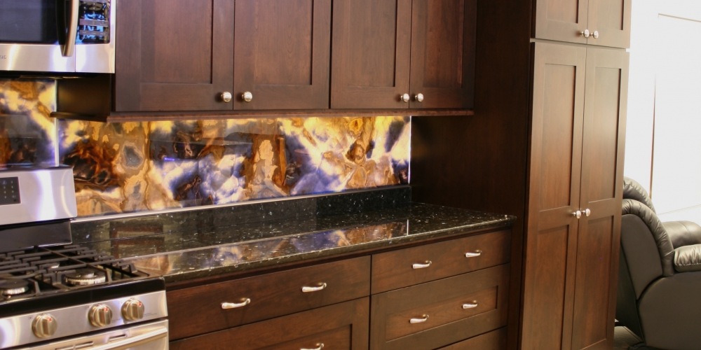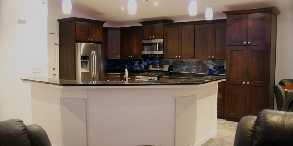 This kitchen remodel in Lancaster, CA displays a perfect unity of beauty and functionality with nothing but the highest-quality materials. DeWils custom cabinetry in a dark espresso, complete with a bulletproof conversion varnish finish, was chosen for this modern and art-inspired kitchen space. The cabinets, made from high-quality plywood construction which helps them resist moisture, are designed to stand the test of time and are matched perfectly with Volga blue granite countertops that have a beautiful irredesence.