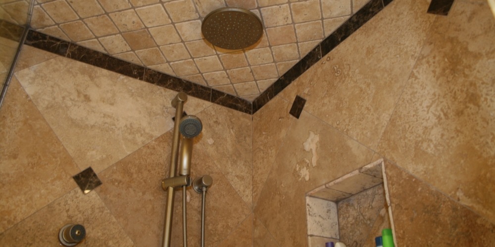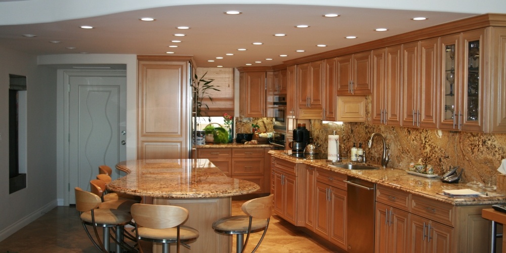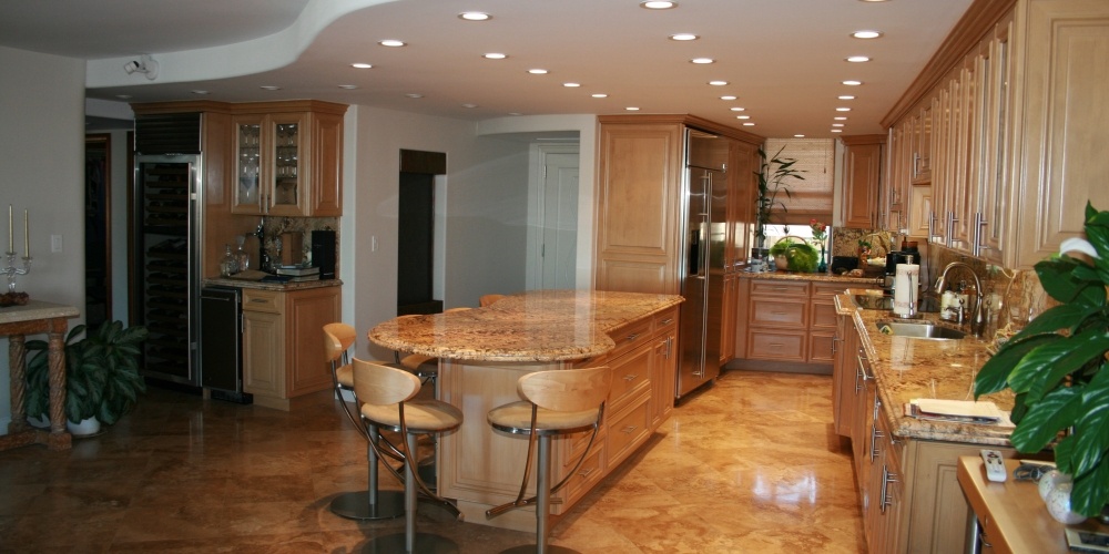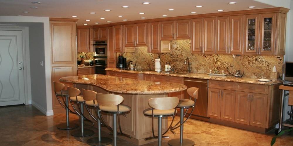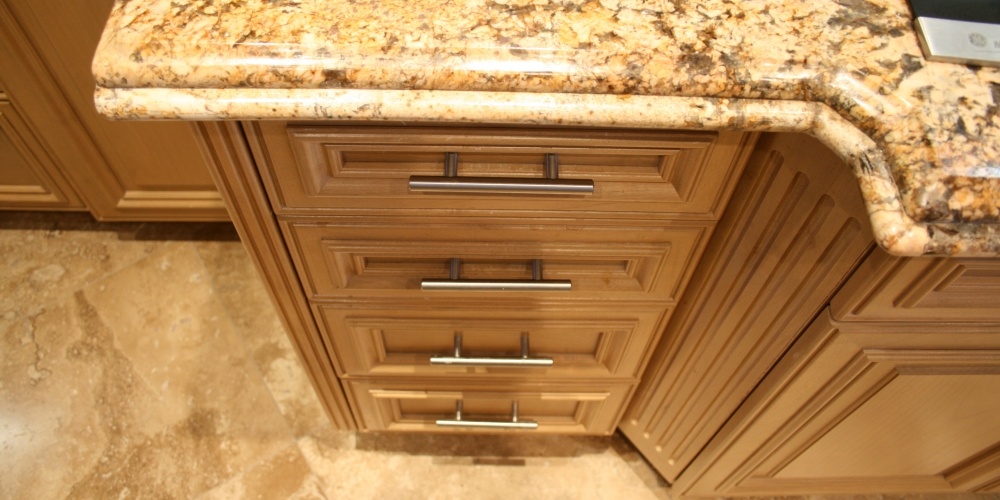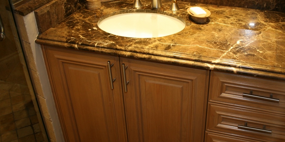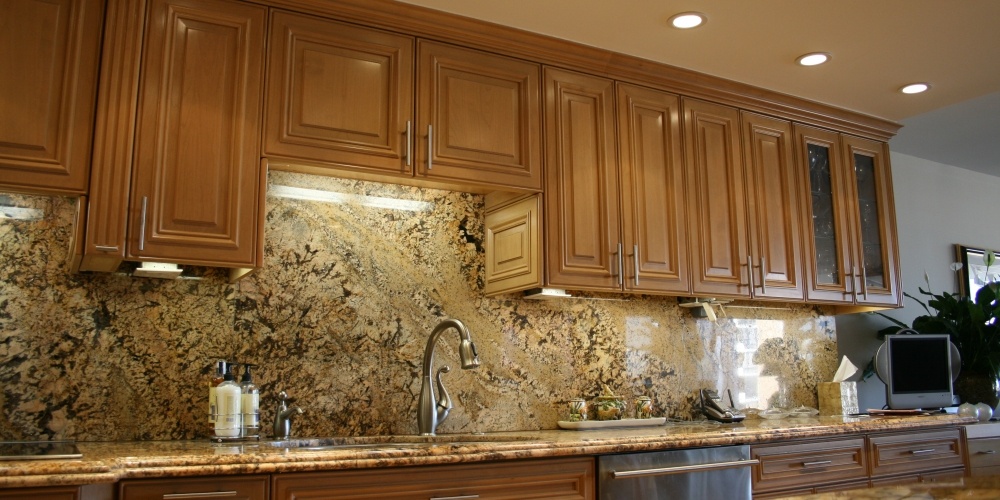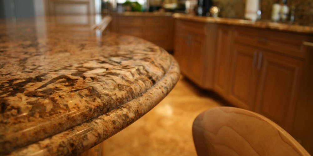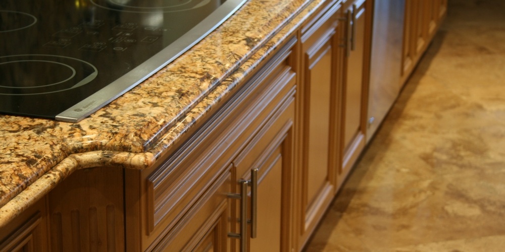 This full kitchen and bath remodel called for harmony gold granite countertops with ogee standoff bull-nose edges and a full granite backsplash.