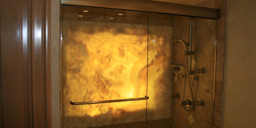 The same quality materials and close attention to detail are brought together in the master bathroom. The beautiful onyx slab serving as the shower wall gives off an elegant warm glow, complimenting the matching onyx slab countertop and onyx vessel sink.