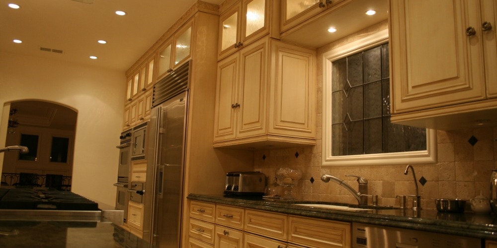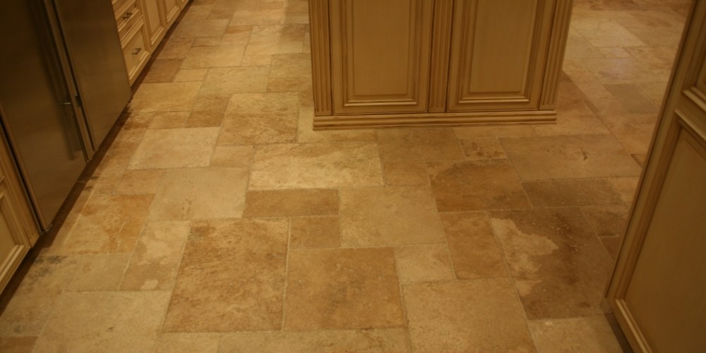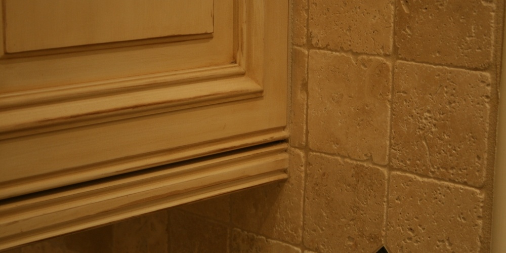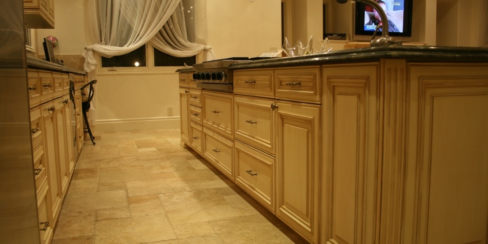 Beautiful verde butterfly granite countertops finished with a tumbled travertine backsplash compliment the cabinetry in this modernized kitchen. The travertine tile flooring wraps around the kitchen to give a beautiful fresh feel from top to bottom.