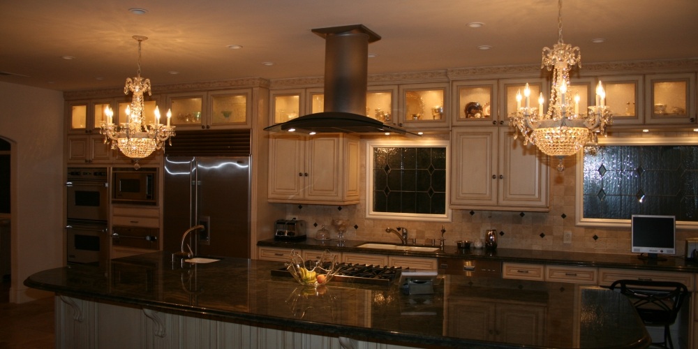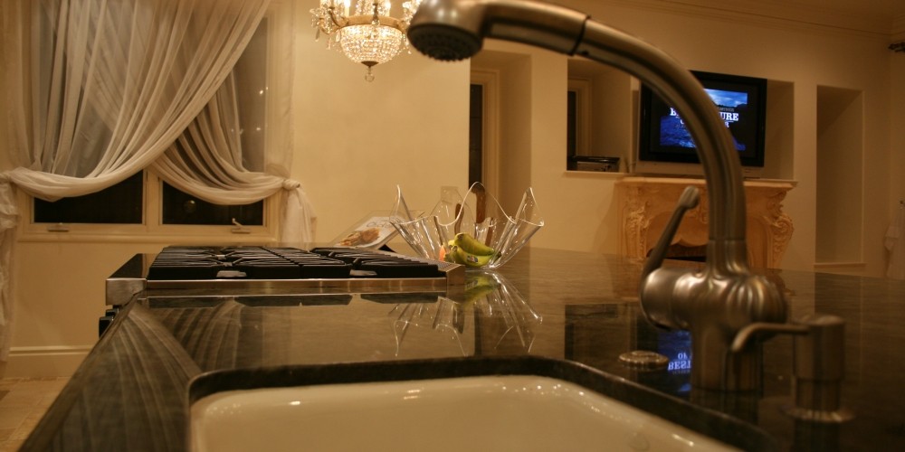 The true pride and joy of this kitchen is the expansive island built from two entire verde butterfly granite slabs. Built into the granite is a secondary stainless steel prep sink, allowing the island to serve as both a decorative addition as well as a multi-purpose piece.